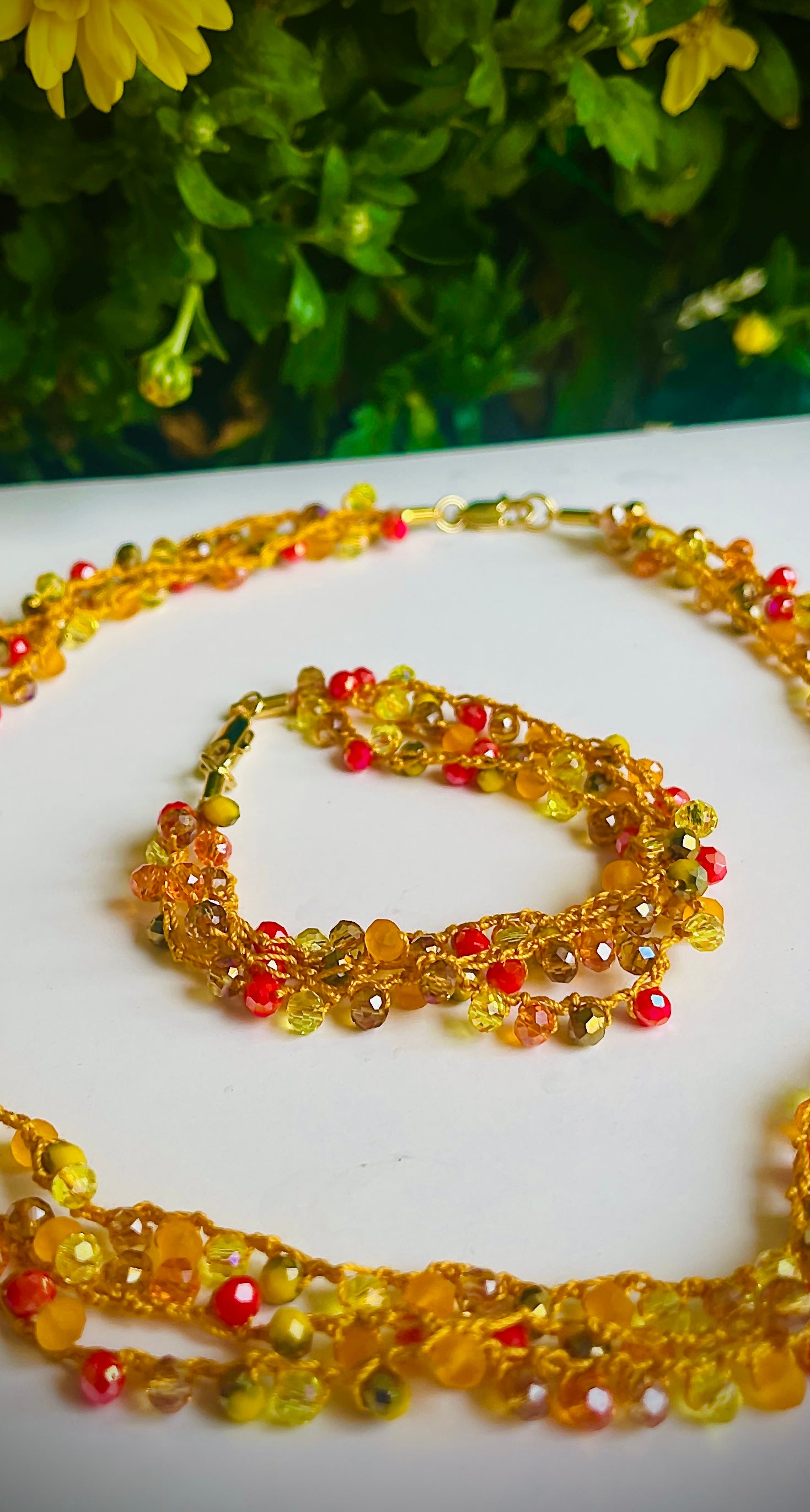 Crafted with sparkling crystal beads and soft 100% cotton thread, this jewelry set captures the warmth and colors of the fall season.