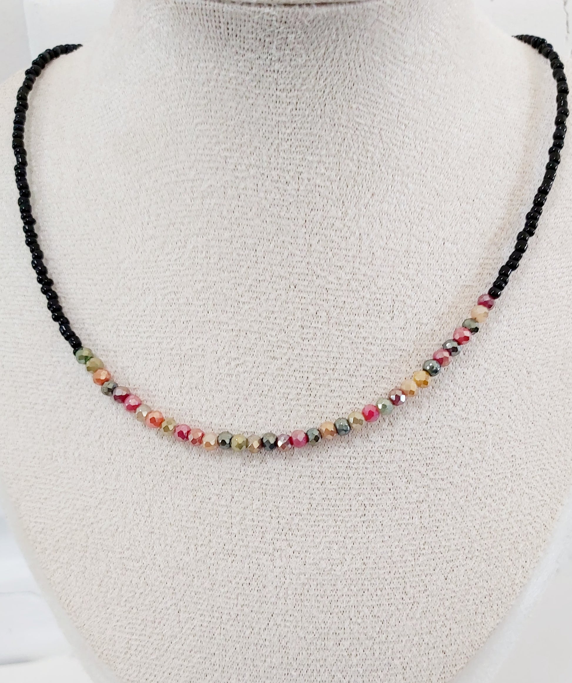 Materials: glass seed beads, 3 mm crystal beads, stainless steel clasp & extension chain