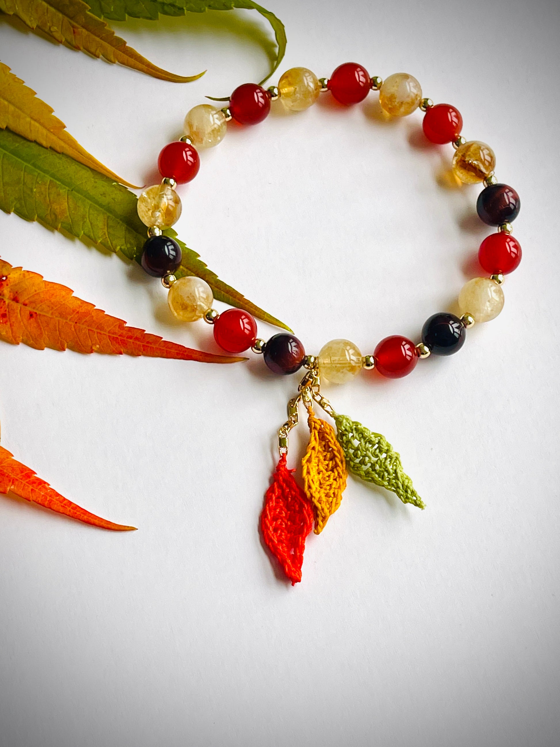 Materials: Tiger's Eye (size 8 mm), Citrine (size 8 mm), hand-crocheted cotton leaves