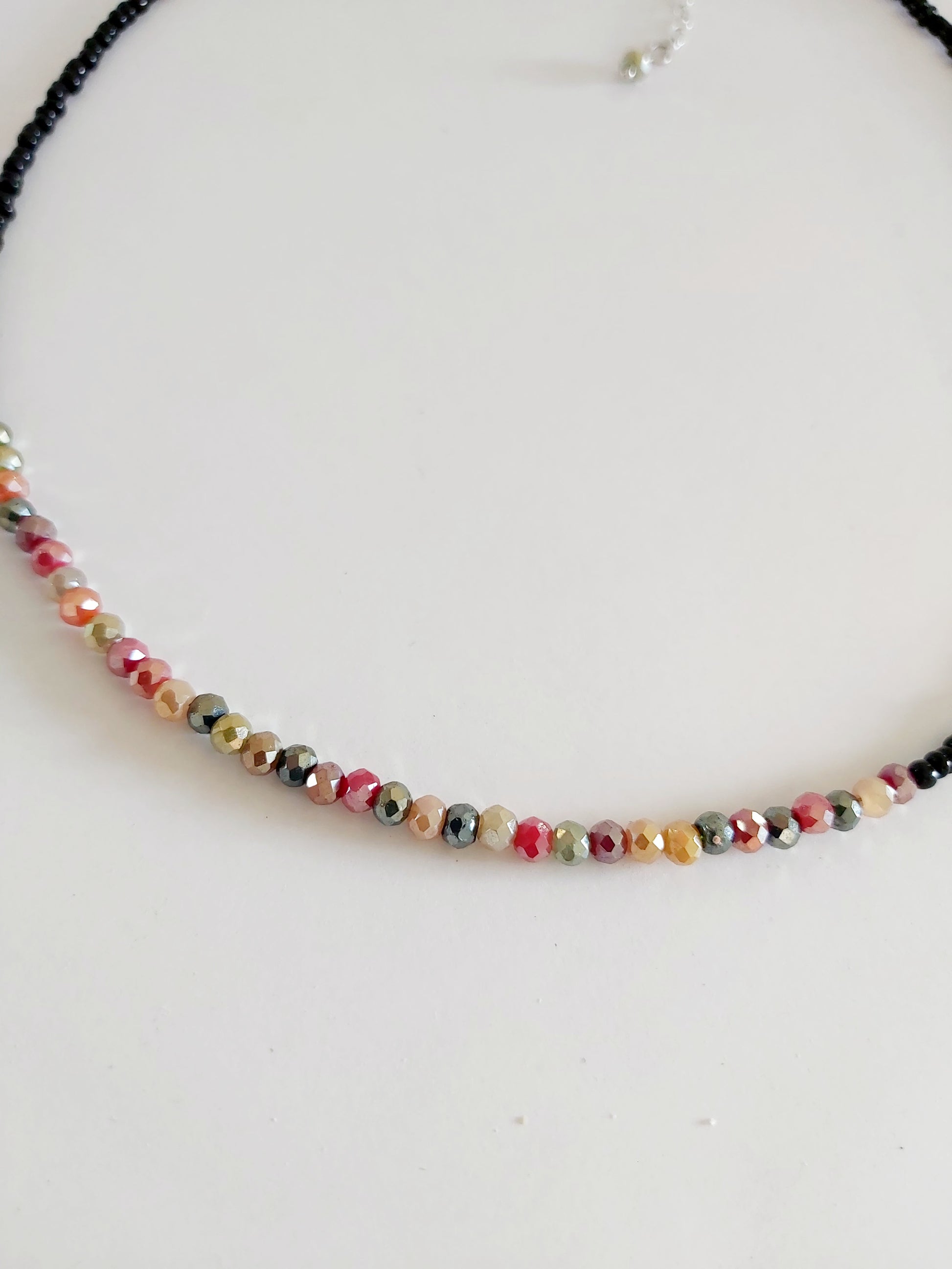 Each bead is carefully chosen and woven by hand: tiny 3 mm crystals in earthy browns, soft golds, vibrant reds, and deep greens. Together, they create a delicate play of light that moves with you — subtle, elegant, and alive.