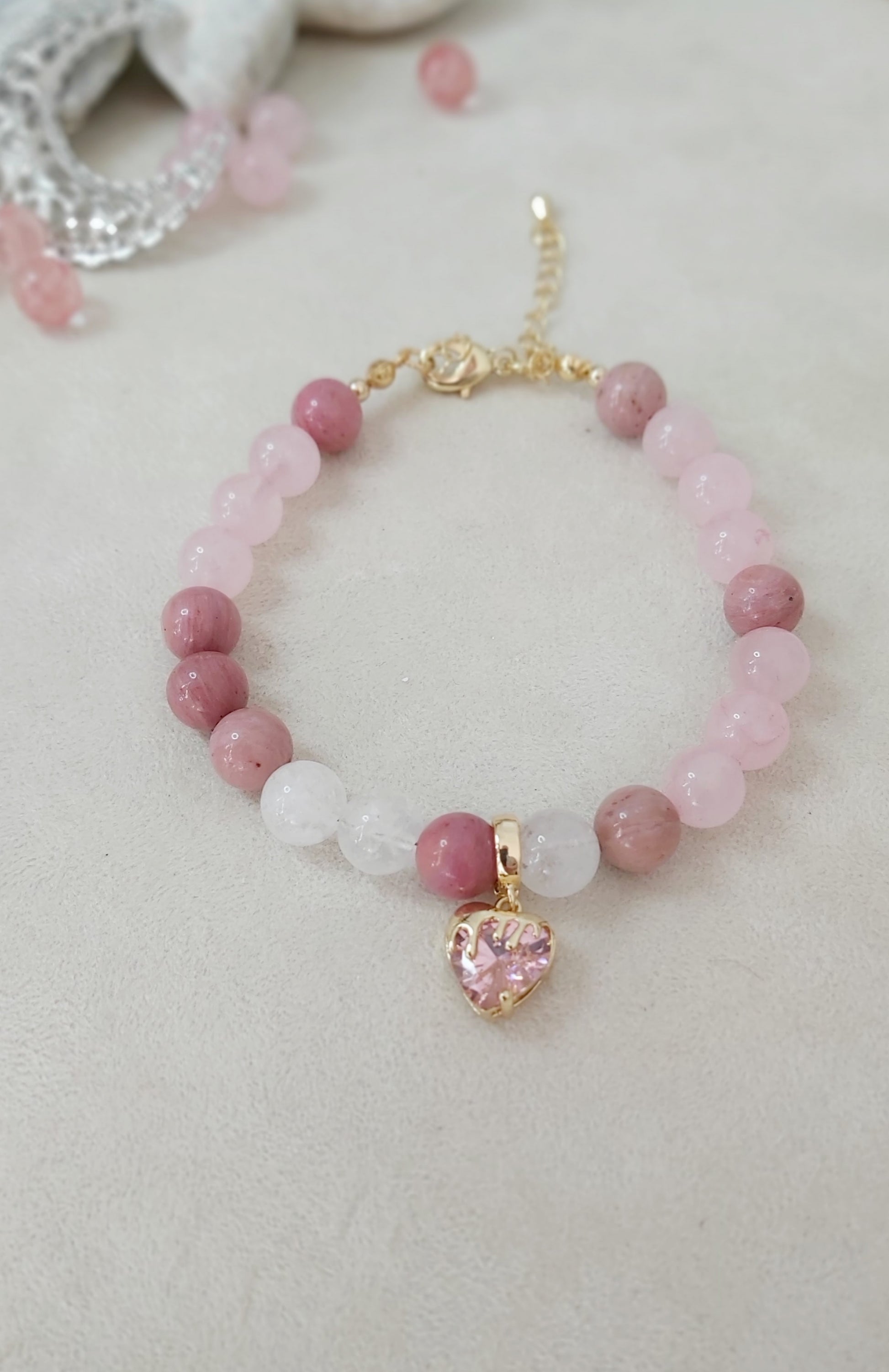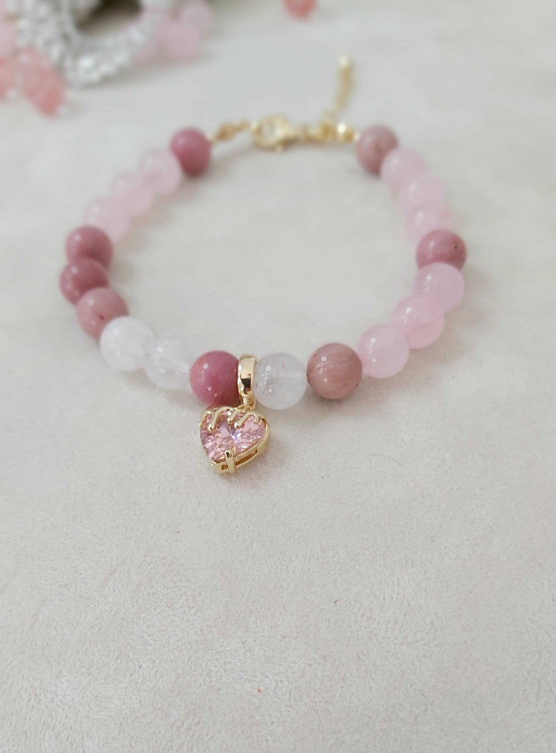 A soft, romantic blend of Rose Quartz, Rhodonite, and Moonstone — gemstones known for their tender, heart-opening energy.
