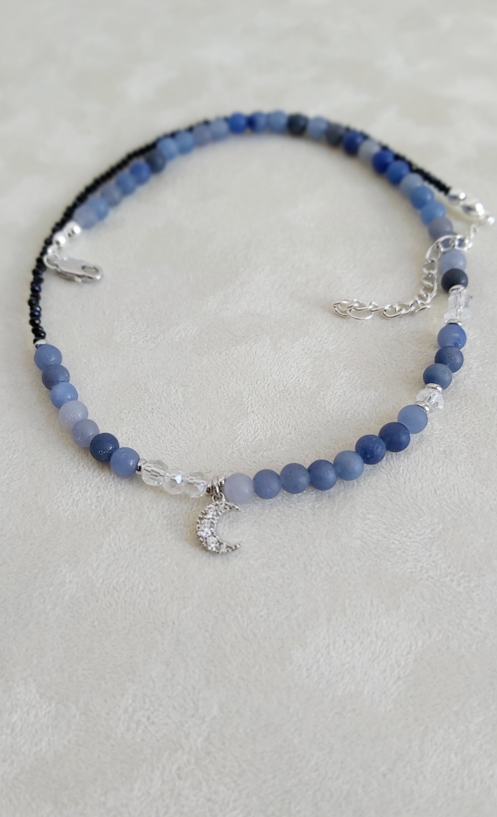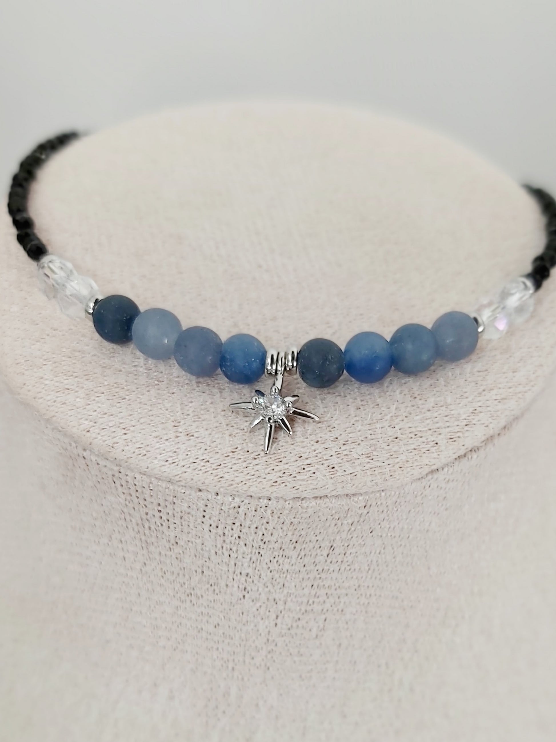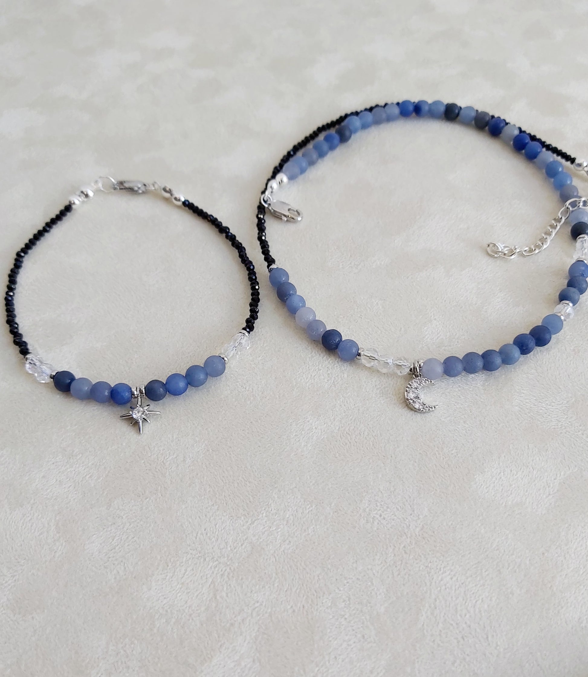 This unique set features blue frosted aventurine, black crystal, and silver moon & star charms, all united into one mystical talisman.