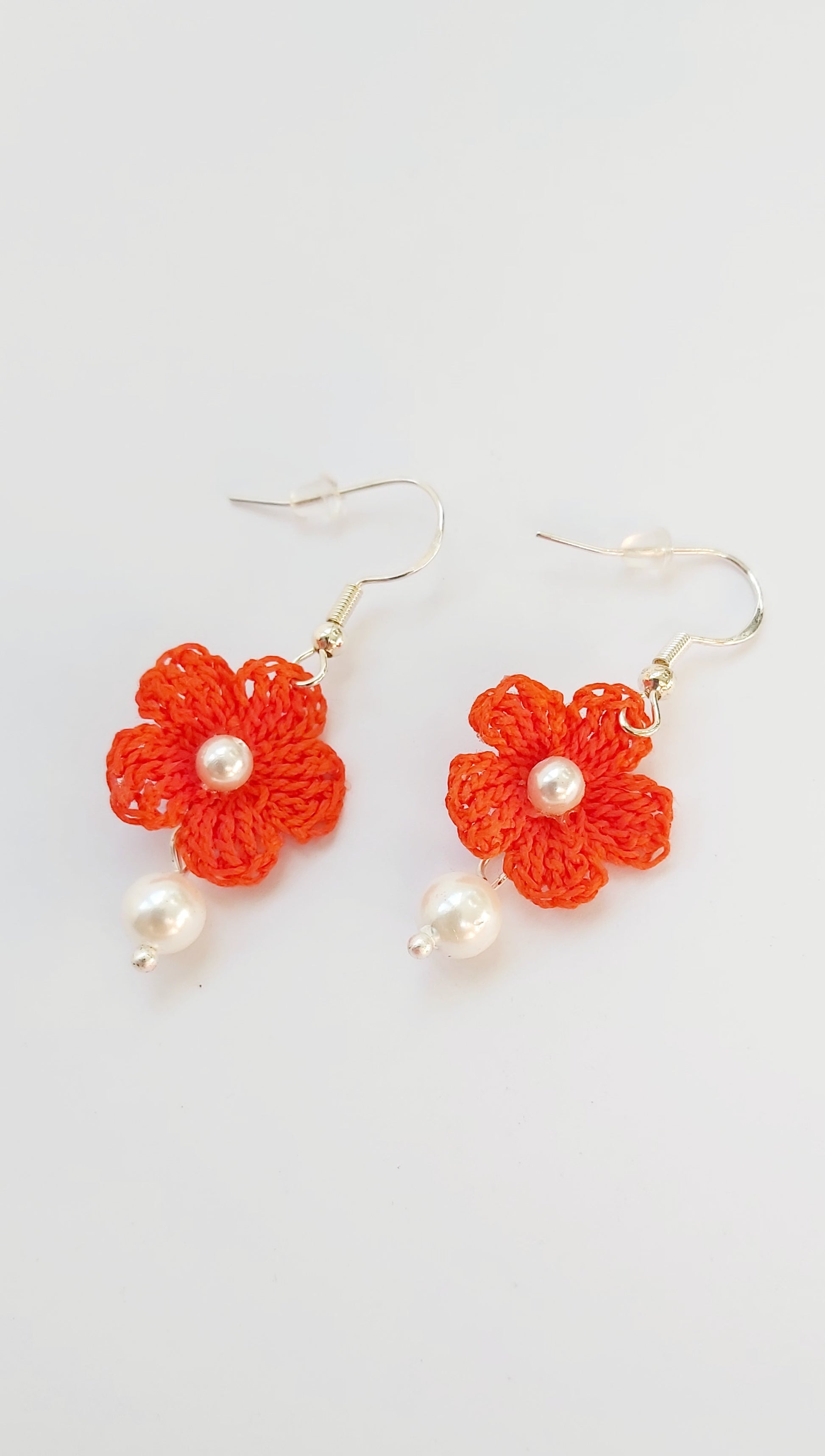 "Sunrise Glow” Bright Orange Crochet Earrings with Natural Pearls