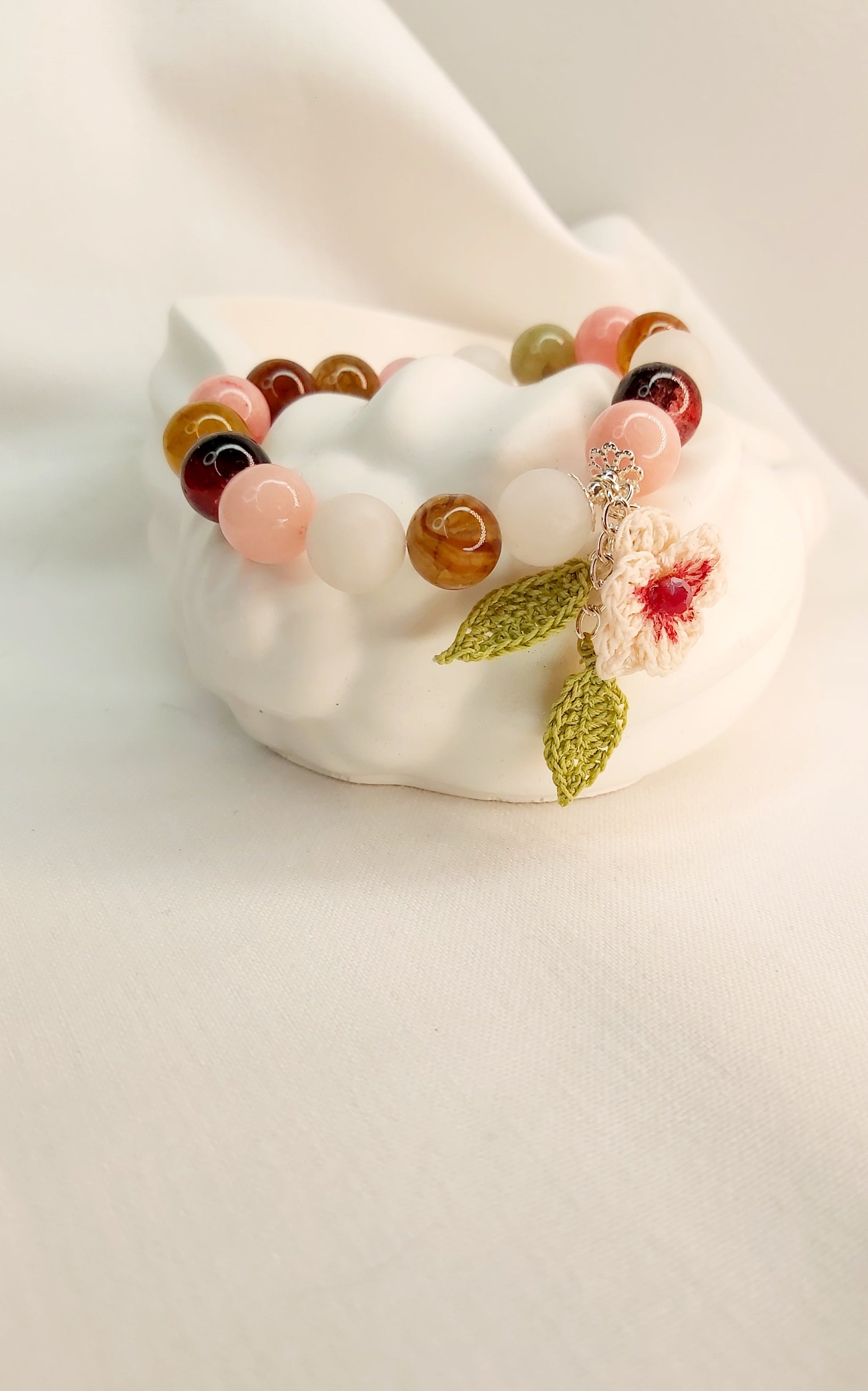 Made with a mix of natural stones such as citrine, quartz, and carnelian, along with colorful glass beads (8 mm), it reflects the beauty of nature’s colors. At its heart lies a delicate hand-crocheted flower and tiny leaves, symbolizing that a touch of spring can always stay with you.